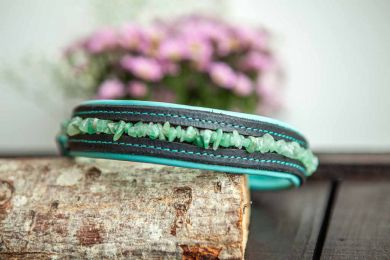 Aussergewöhliches Halsband aus schwarzem Fettleder, in das eine Kette aus Aventurin-Heilsteinen eingenäht wurde. Unterlegt ist das Halsband mit türkisem Nappaleder. Die Steine wurde aus rein optischen Gründen ausgewählt.