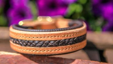 Unterlegt ist das Halsband mit dunkelbraunem Rindsnappa.