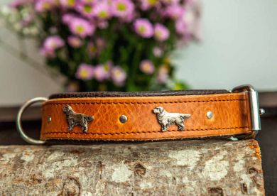 Süßes Halsband aus cognacfarbendem Oberleder, besetzt mit silbernen Retriever-Nieten im Wechsel mit silberfarbenden Hohlnieten.
