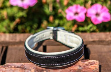Schlichtes Halsband aus schwarzem Fettleder, unterlegt mit weißem Rindsnappa und mit weißen Nähten versehen.