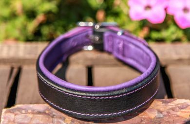Schlichtes Halsband aus schwarzem Fettleder, unterlegt mit lilafarbendem Hirschnappa ( extrem weich) und mit einer lila Naht versehen.