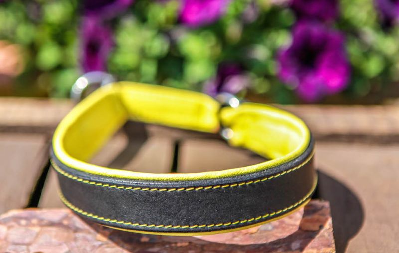 Schlichtes Zugstop-Halband aus schwarzem Fettleder, unterlegt mit gelben Rindsnappa und mit gelben Garn genäht.