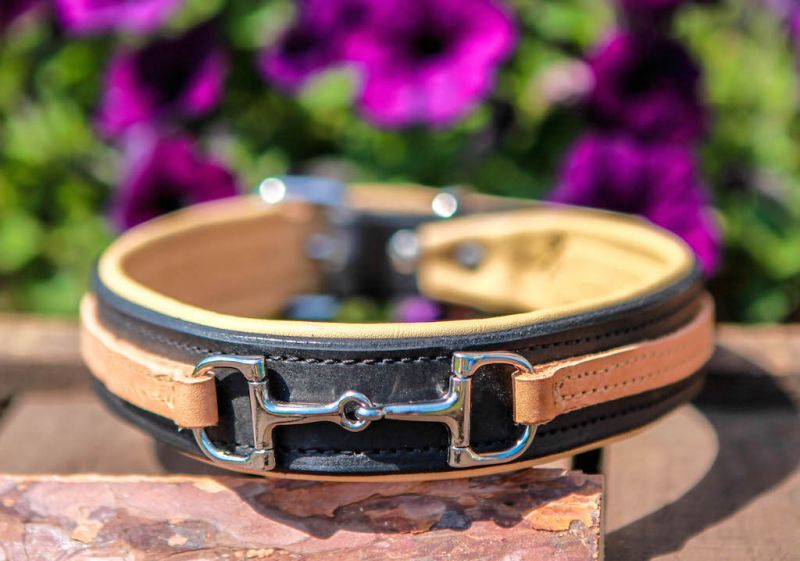 tolles, auffälliges Halsband- nicht nur für Reiter.Das schwarze Fettleder wird durch e in silberfarbendes Gebiss und zwei beige Lederstreifen verziert.
